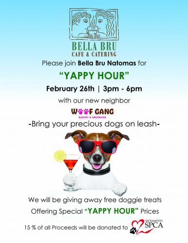 Come on out to Bella Bru Cafe Natomas on Wednesday, February 26 from 3pm – 6pm to enjoy a delicious menu featuring Happy Hour (Yappy Hour) pricing. Feel free to bring your dogs on leash and sit outside on the patio to enjoy your meal. Our new neighbor, Woofgang Bakery, will be onsite selling dog-related items. Proceeds from the evening will be donated to the Sacramento SPCA. They will be onsite with an informational table and an adoptable dog!