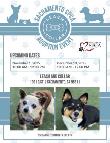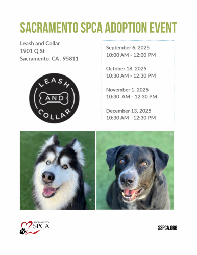 The Sacramento SPCA will be at Leash and Collar Dog Boutique with adoptable dogs! Come out, shop around, and go home with a new four-legged friend!