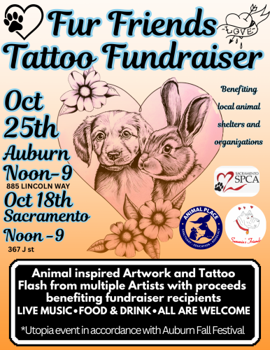 Come out to White Buffalo Gallery in Sacramento on October 18th or Utopia Tattoo Shop in Auburn on October 25th for the Fur Friends Tattoo Fundraiser.